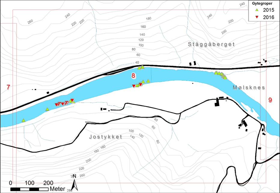 Gytegropregistering i Stjørdalselva utført i perioden 14. - 18.11 og 21. - 22.11.2016 som er to uker senere enn tidligere år og skyldtes høy vannføring og en del kjøring av Meråker kraftverk.