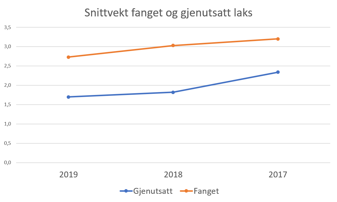 Fra fangstrapporten i Inatur, henter vi ut statistikk om fanget og gjenustadd laks.