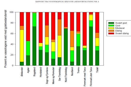 Fordeling av andelen laksebestander på fylkesbasis og for landet samlet med ulike klassifiseringer avbestandsstatus (fra svært god til svært dårlig) ut fra en samlet vurdering av om de hadde oppnådd gytebestandsmål og hadde et normalt høstbart overskudd for perioden 2010-2013. Hvert vassdrag er veid med gytebestandsmåletslik at større bestander teller mer enn små bestander. Merk at Østlandet består av fylkene Østfold, Oslo ogAkershus, Buskerud, Vestfold og Telemark, at Aust- og Vest-Agder er slått sammen til Agder, og at Finnmark er vist med og uten Tanavassdraget. Tanavassdraget teller som én bestand i denne framstillingen.