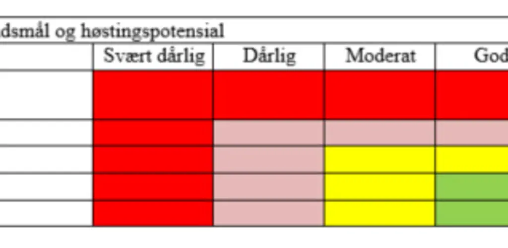 Klassifiseringen av de bestandene i Finnmark som er med i rapporten. Den første fargelagte kolonnen viser gytebestandsmål og høstingspotensial, den neste viser genetisk integritet og den tredje og siste kolonnen viser klassifiseringen i henhold til kvalitetsnormen, som er basert på de to første kolonnene.