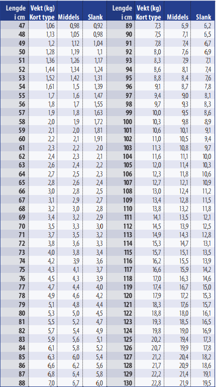 Vekttabellen nedenfor gjelder for norsk atlantisk villaks og er utarbeidet av Norsk institutt for naturforskning.