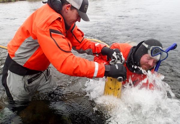 Prosjektet er ment å pågå i mange år fremover, og årlig skal deler av smoltproduksjonen i elva vår merkes med det knøttlille PIT- merket som altså nå kan fanges opp av antennesystemet i fjordbunnen. Bildene er fra utbyggingen av systemet ved nedre vakthytte nå i september.