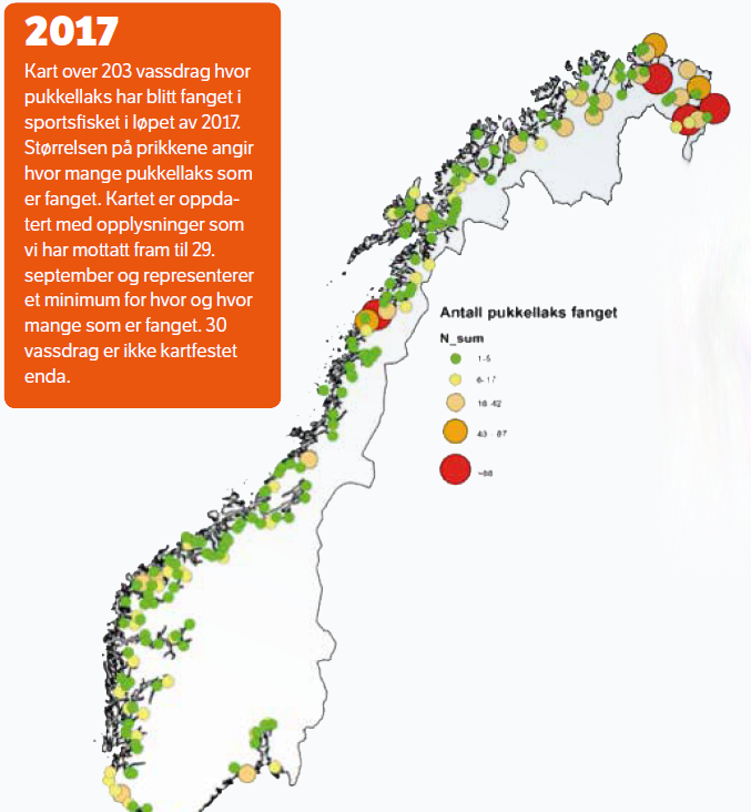 Så langt (29. september) har vi i NINA samlet inn meldinger om at ca. 2500 pukkellaks er fanget i sportsfisket i ca. 233 ulike vassdrag (tabell 1, tabell 2). I tillegg har vi mottatt meldinger om ca. 200 som er fanget med sportsfiskeredskap i sjøen og ca. 160 som er fanget i sjøfiske med kilenot og krokgarn. Det er også tatt ut flere tusen pukkellaks i uttaksfiske, men her har vi ikke noen god oversikt ennå. Pukkellaks er tatt i elver langs hele kysten fra grensa mot Russland i nordøst til Glomma i sørøst (figur 1). Det er ikke bare i Norge at det har vært gjort fangster av pukkellaks i år, det har også kommet meldinger fra Sverige, Danmark, Tyskland, Frankrike, Storbritannia, Irland, Island og New Foundland (Canada).