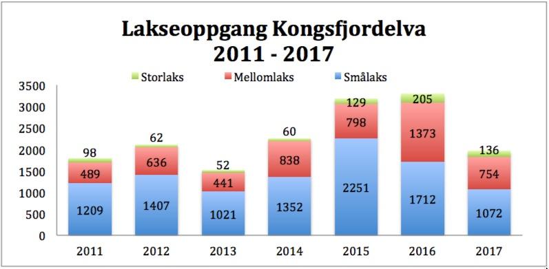 Vi vil fremover presentere noen av resultatene fra overvåking og fisket i Kongsfjordelva sesongen 2017. For sesongen som nå er forbi kan vi slå fast at det ble en noe annerledes og uventet sesong. Først med de enorme vannmengdene med flom til langt utpå sommeren, som igjen ga forvaltningen store problemer. Så kom også pukkellaksen, og det uventet mange. Men la oss nå begynne med begynnelsen.