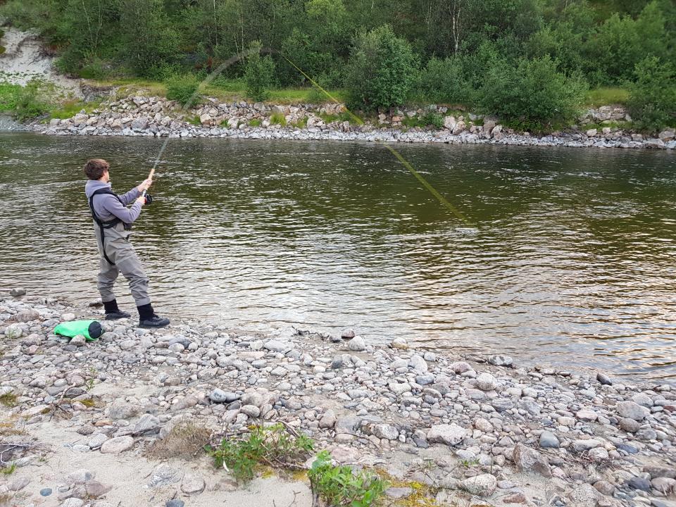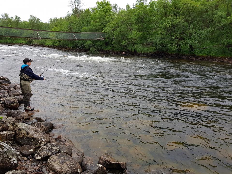 Konsta kom hele veien fra Mikkeli i Finland. Her prøver han en liten sluk oppe i sone 3. Vi så noen laks hoppe på denne økta, men dessverre ville ingen bite.