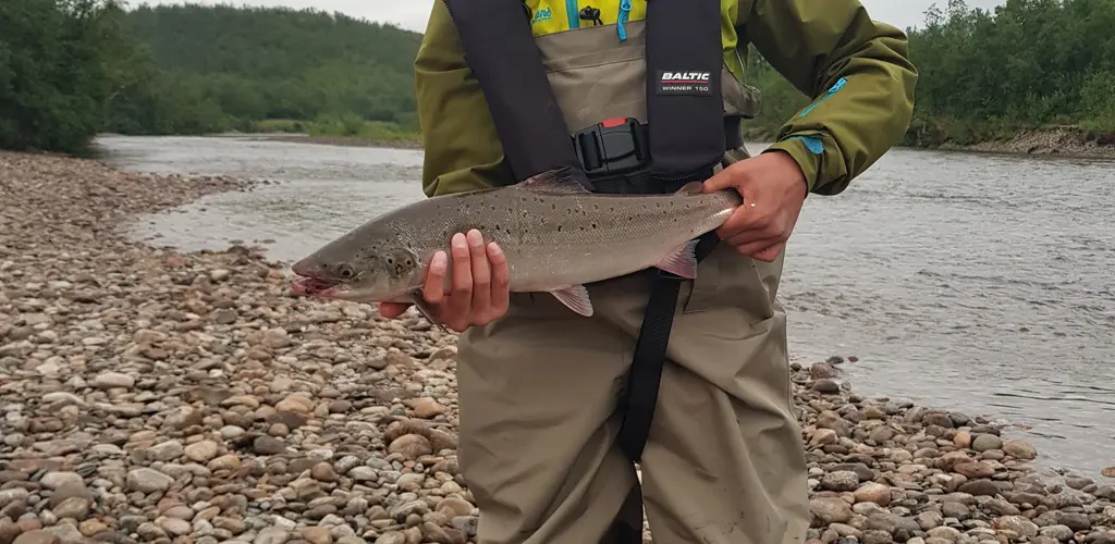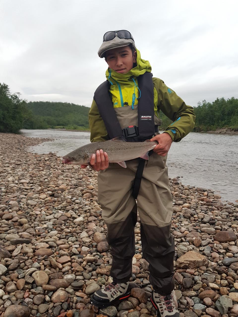 Bendik poserer med laksen han fikk. Bendik var en forholdsvis erfaren laksefisker, til tross for sin unge alder, og gikk for en liten flue. Det ga som vi ser god uttelling! Foto: Tom Rune Storhaug Lindbäck