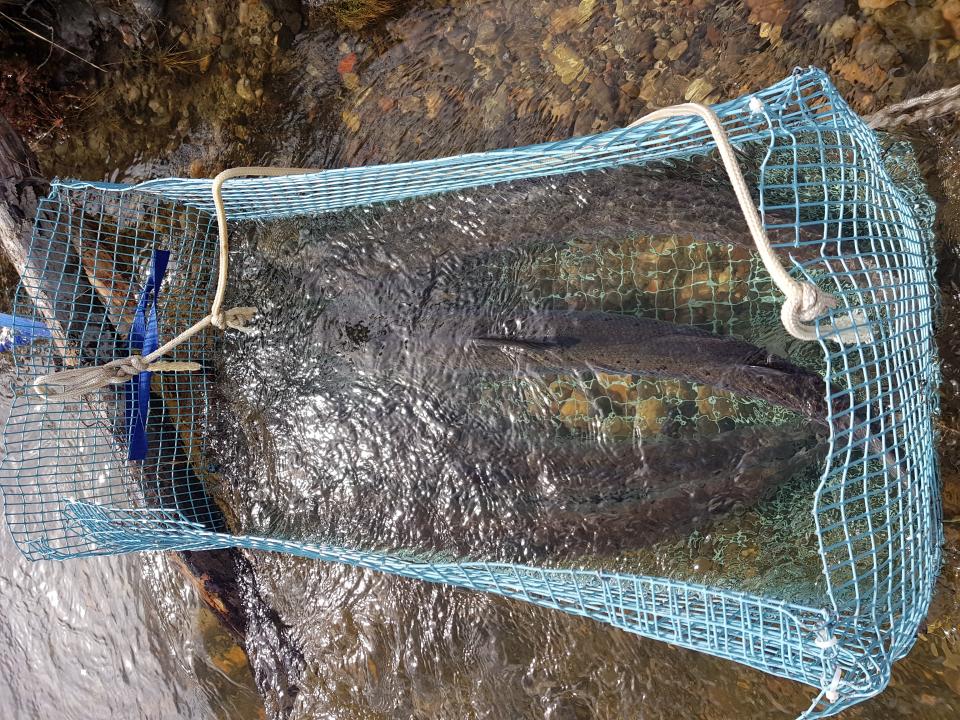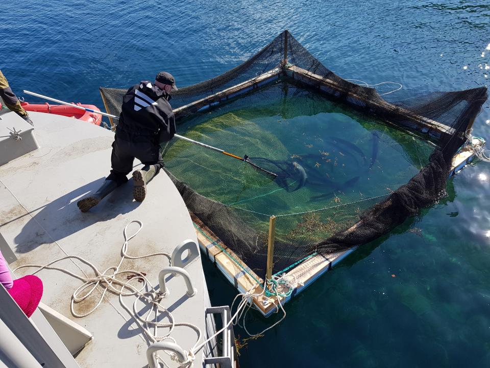 Etter å ha stått noen dager i saltvann, var det tid for merking. Her håver Audun Rikardsen inn en støing som blir overført til et kar hvor det er blandet bedøvende væske i vannet.