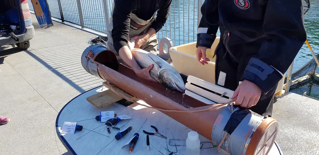 Merket festes under ryggfinnen til laksen. Selv om merket kan virke stort, er det positivt flytende, så det er påpekt at det ikke er til noen stor belastning for fisken.