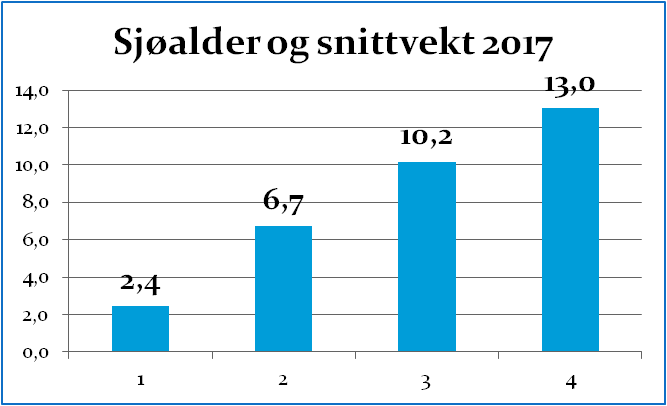 Denne tabellen viser hvordan veksten er på laksen ut fra hvor mange vintre den tilbringer i sjøen. X-aksen viser antall vintre i sjøen, og y-aksen viser snittvekten (N1=23, N2=16, N3=42, N4=7).