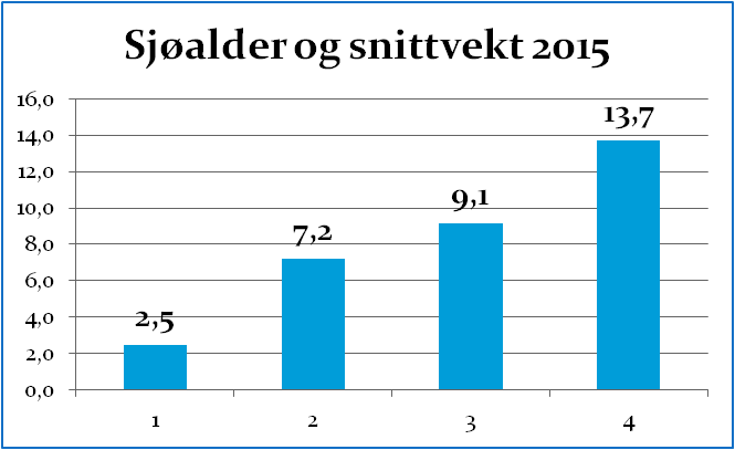 Denne tabellen tar også utgangspunkt i veksten til laksen ut fra hvor mange vintre den har tilbragt i sjøen, men her er tallene hentet fra skjellprøvene fra 2015. Lange tidsserier med skjellprøver vil derfor kunne være med på å gi et svar på hvordan fødetilgangen kan ha vært i havet. (N1=36, N2=17, N3=39, N4=6)
