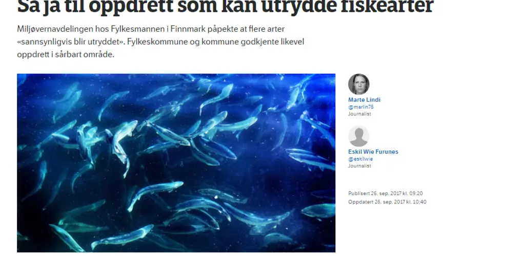 Skjermdump fra NRK Finnmark 26. september 2017 om godkjenning av nytt oppdrettsanlegg i Vedbotn.