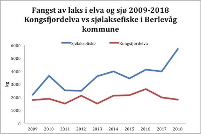 Fangststatistikken fra SSB som er tilgjengelig for sjølaksefisket er ikke spesifisert på lokalitet. Det nærmeste man kommer er kommune. For Berlevåg ser man markant økning for 2018 om man tar siste 10-årsperiode (2009-2018). For Kongsfjordelva viser avlivet fangst ganske stabilt med noen mindre topper i toppsesonger og lavere i sesonger med lite laks.