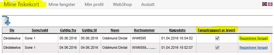 Klikk på kolonneoverskrift (markert gult) for å sortere på feltet "Fangstrapport er levert" (klikk evt en gang til for å sortere motsatt vei), og klikk på registrer fangst om dere har kort det ikke er rapportert på: